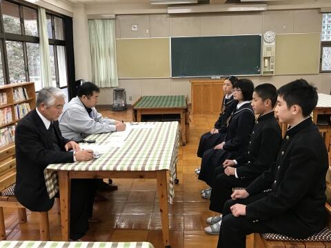 五ヶ瀬中学校では、毎年3年生の面接練習の際に、地域の方々の協力で面接官をしていただきます。今回は面接官として、8名の方々に来ていただき、4会場で実施しました。12月末から校長先生を始め、職員で練習をしてきましたが、今回は普段接しない方々との面接練習だったのでとても緊張したようです。私立高校や県立高校での面接で生かせることをたくさん得られたようです。