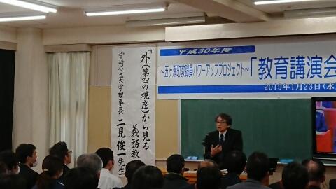 五ヶ瀬町内の全ての小・中学校の先生方を対象に、町教職員パワーアッププロジェクト教育講演会が行われました。講師に宮崎公立大学理事長 二見 俊一先生をお迎えして、「外(第四の視座)から見る義務教育」という演題で、市議会の答弁のビデオを見せていただきながら、これからの学校教育に必要な資質を考えさせられ、充実した時間となりました。