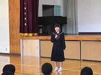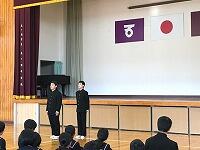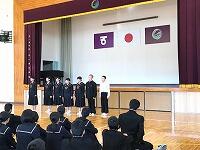 県大会に出場する、剣道部、女子ソフトテニス部、軟式野球部、卓球の決意表明の後、3年生から生徒代表激励の言葉と、体育大会の団長2人によるエールが送られました。