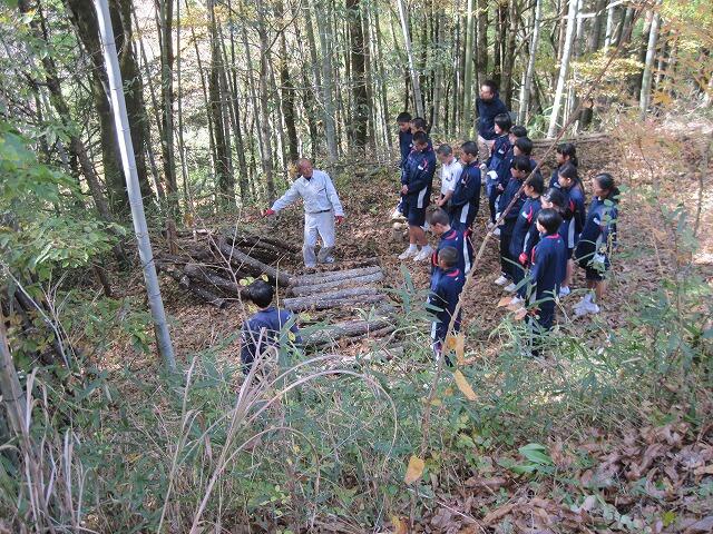 本日、五ヶ瀬町おたすけ隊の甲斐梅男様に教えていただきながら、椎茸のほだ木組みを行いました。1年生と梅男さんと手際良く組んで、短時間で終了しました。