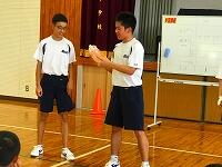 スローガン発表のあと、生徒会長の甲斐さんと体育大会実行委員長の田中さんが