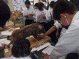 「イノシシの門歯、犬歯、臼歯の特徴を草食・肉食動物の歯の特徴と比較し、雑食性の動物であると根拠をもって推測し、説明すること」が目標の授業で、剥製や骨格標本を用いて、①推論②観察③生徒が根拠を用いて説明という流れでした。生徒は、意欲的に授業に取り組み、自分の意見「草食、肉食、雑食」をしっかりと根拠をもとに説明することができました。「推論」「具体例同程」といった、リーディングスキルに視点を置いた発問の工夫がなされており、生徒のリーディングスキル向上の一助にもなったと思います。