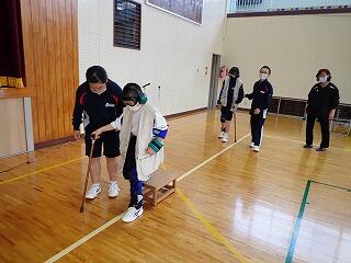 講師に五ヶ瀬町社会福祉協議会の方々、西臼杵広域消防事務組合の方をお招きして、「救急法」「アイマスク体験」「ハンディキャップ体験」「車いす体験」の4つの体験をしました。