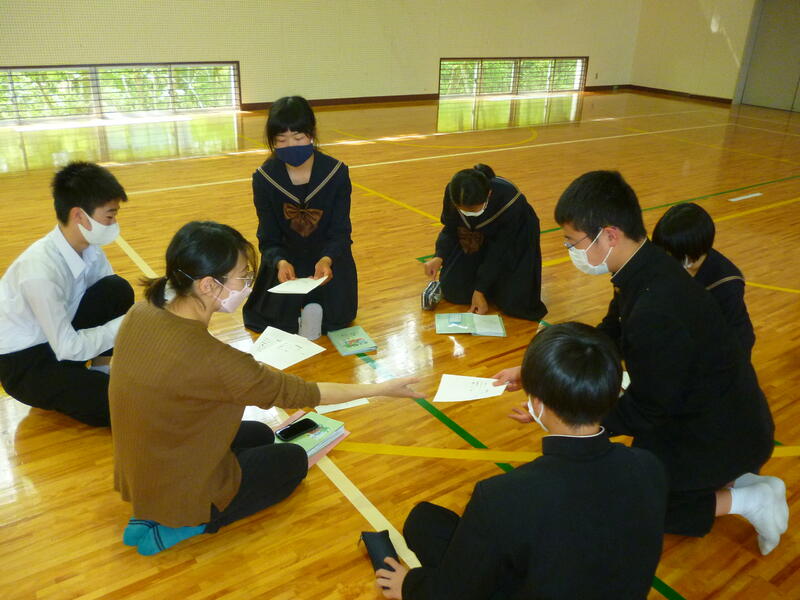 5校時の事前指導は、密を避けるために体育館において行いました。全体で確認を行った後、班ごとの最終打合せを行いました。