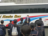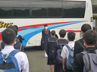 7時40分過ぎから、Gドームの前にて出発式が行われました。今回の修学旅行の団長である教頭先生、そして実行委員長からのお話のあと、さっそくバスに乗り込んで出発です。