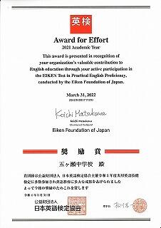 昨年度の五ヶ瀬中学校生徒の、英語検定への取組が認められて、先日下の画像のように奨励賞が届きました。