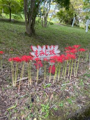 学校にご用の際はぜひ、期間限定でもみじ坂に咲く鮮やかな彼岸花をお楽しみください。ただし、通行量は少ないとは言え車が通りますので、鑑賞される際は交通安全には十分ご留意ください。