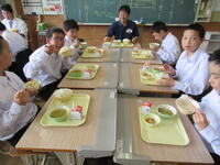 5月8日に、コロナが5類に移行されたことで、本校の給食も以前のようにグループをつくって、お互いの顔を見ながら美味しくいただいています。いつもの給食が、ますます美味しく、楽しくなりました。