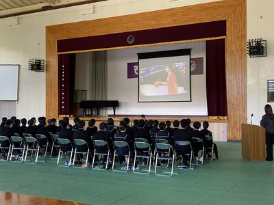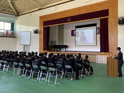上記の写真は2時間目。体育館で全校生徒を対象に行われた健康集会の様子です。