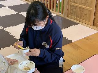 今日のパン、「もちもちお茶めパン」は、三ヶ所小学校で収穫した茶葉から作られた釜炒り茶を粉末にし、練り込んだものです。いつものパンと違う風味や味を感じながらいただきました。