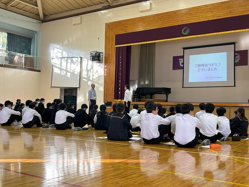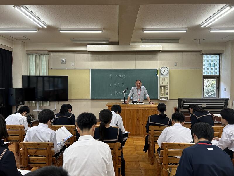五ヶ瀬町社会福祉協議会の渡邊様にお越しいただき、「仕事に就くまで・仕事内容・地域とのかかわり・福祉」について、お話いただきました。その中で、「利用者さんのできていることに目を向けて、長く続けられるようにサポートしたい」「次の世代へバトンタッチできるようにしたい」などお話してくださりました。