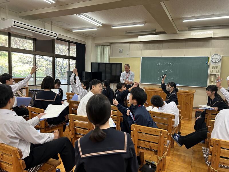 ふくしの「ふ」は?「く」は?…の問いでは、福祉のイメージを思い浮かべながらワードを考えました。渡邊さんの【ふつうに・くらせる・しあわせ】という考えに生徒一同「おお~!」という反応を示していました。