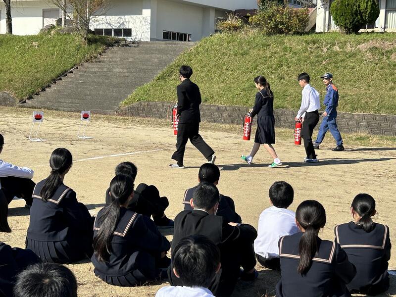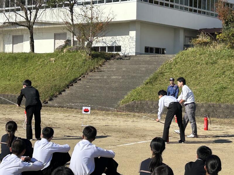 講師として西臼杵消防署の方々にお越しいただき、火事が起きたときの対応の手順や消火器の使い方について教えていただきました。