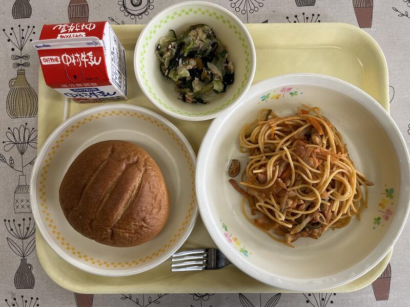 「米粉パン、ひむかナポリタン、海藻サラダ」