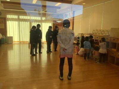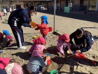 クラスごとにメンバーを振り分け、事前の家庭科で用意した遊び道具や保育所のおもちゃ等で遊びました。また後半は全クラス外に出て遊びました。中にはGパークでサッカーを全力で楽しむクラスもありました。短い時間ではありましたが、保育園の子どもたちとの仲が深まり、帰るのが名残惜しいという雰囲気でした。