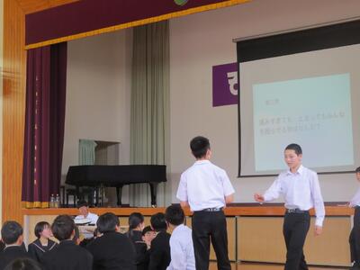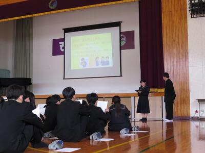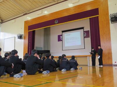生徒会から、学校のルールなどについて話があった後に、各委員会から学校生活で気を付けてほしいことや、決まりについての説明がありました。