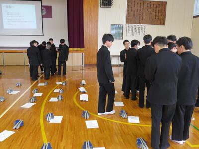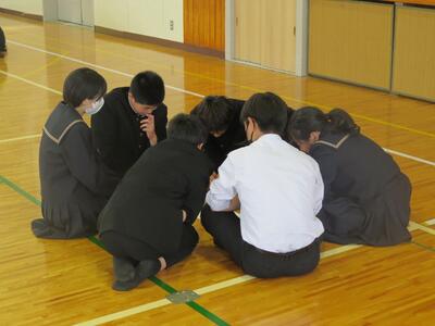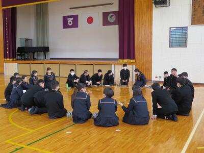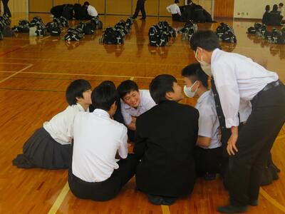 全校生徒が体育館に集まり、1~3年生の縦割りで8班に分かれて協議を行いました。