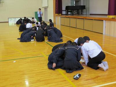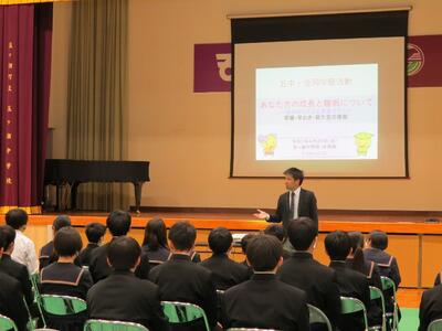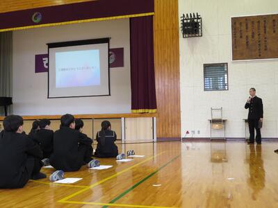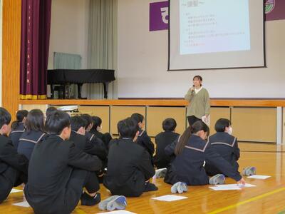2時間目は、体育館で全校生徒を対象に健康集会が行われました。毎朝記入している「健やかファイル」を記入する目的や、日々の生活の中で睡眠時間の振り返る活動をしました。睡眠時間を確保することは、学力(記憶の定着)に関わってくること、同時に体の機能向上に繋がるだけでなく、心の安定にも関わる本当に大切なことであると、みなさんにも届いたと思います。
