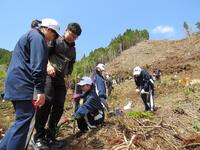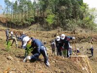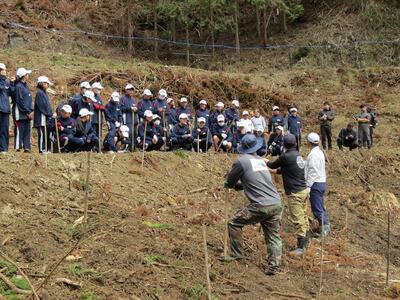 斜面に植樹する作業は大変で、悪戦苦闘しながらも植えることができました。自然の偉大さに触れながら、次の世代へと成長していく木への思いを込めることができる機会となりました