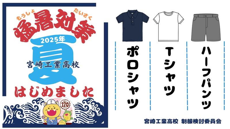 近年、夏季の気温上昇が顕著となっており、熱中症リスクが高まっていることから、宮崎工業高等学校では、生徒の命を守る対策として、生徒が学校生活においてポロシャツ等の準制服を着用できるようにしました。