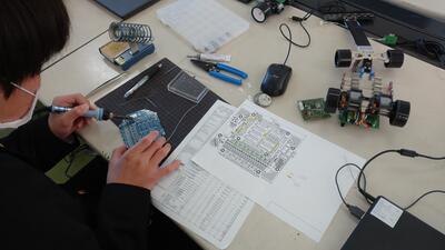 今日は1年生が上級部門であるAdvancedClassのモータードライブ基板の製作を行いました。この基板は4つのモーターを独立して回転させる事でより高速走行が出来るようになります。