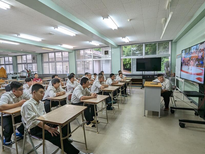 部員同士で互いの試合動画を見合い、良かった点・改善点を意見し合う姿は