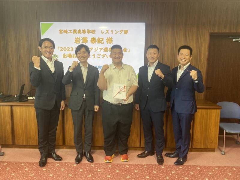 宮工からは、中別府校長、レスリング部の岩澤くんと顧問の柴田先生の計3名が市役所を訪問しました。