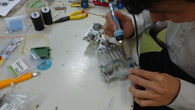 また、Basicクラスからステップアップした1年生2人もAdvanceクラスで大会に出場しました。連日夜遅くまでマシン製作で何度も失敗しながらも、諦めずにマシンを仕上げ、何とか本番ではスタートラインに立てましたが調整不足により残念ながら完走する事が出来ませんでした。
