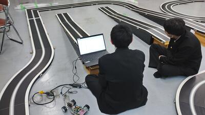 新たに今大会から挑戦したCameraクラスは、車の自動運転の基礎技術を用いたカメラで撮影したコースの画像を2値化(白と黒に変換)してライントレースするマシンです。こちらも初めて挑戦する1年生が試行錯誤しながら走行調整を行い本番へ臨みましたが、コース上の明るさに合わせたセッティングを合わせ込む事が難しく、過去最長の距離を走行をしましたが惜しくも完走ならずでした。