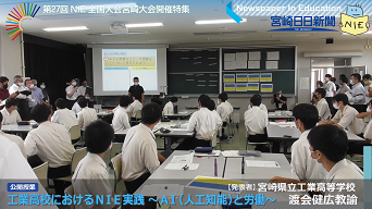 8月5日、第27回NIE全国大会 2日目が宮崎公立大学にて行われ、本校電子情報科2年生が「工業高校におけるNIE実践 ~AI(人工知能)と労働~」をテーマに公開授業を行いました。
