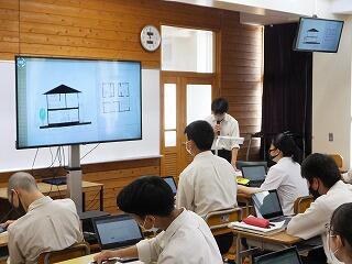 エスキスとは、設計におけるコンセプトや概要を下描きやスケッチで表したものです。生徒は、それぞれが考えた木造住宅について工夫した点を交えながら学級の他生徒や職員に向けて発表していました。建築科では、木造や鉄筋コンクリート建築物の製図について基礎・基本を学習します。
