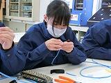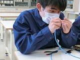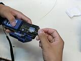 光ファイバー接続体験では、髪の毛よりも細い光ファイバーの外皮を剥ぎ、清掃し、2本の光ファイバーを融着するという作業を体験しました。融着器も高額であるため、普段、学校での実習では体験できません。今日はプロの技を見せていただくとともに、丁寧な指導の下、手順を守りながら繊細な作業を体験しました。