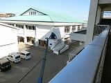高所作業車乗車体験では、高い時には校舎の4階に匹敵する高さまで上昇し、校内に張られている通信線などを間近に見せていただきました。揺れるバケットの中で先に体験した繊細な光ファイバーの融着作業などをすることを想像すると…作業をされる方のプロフェッショナルな姿に感心するばかりでした。
