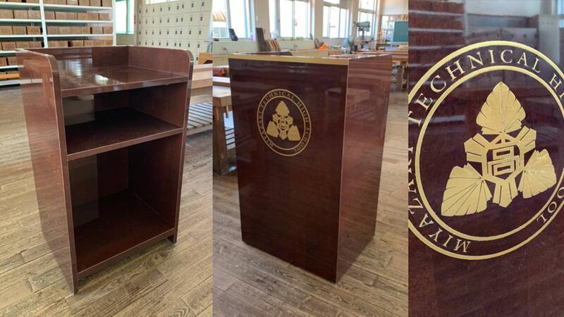 ベースはテクスチャの入ったエンジ色で、正面には校章をゴールドのカッティングシートで貼り、重厚感を出すことができました。