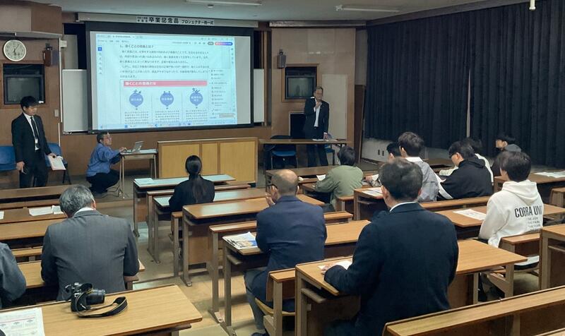 今回のセミナーには、日本労働組合総連合会宮崎県連合会より会長の吉岡様、宮崎県労働委員会より黒木様が来校され、就職先での職場トラブルに遭わないために「労働に関する法規」を中心とした講話をいただきました。