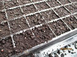 グランドデュークという品種のコールラビの種をまきました。128穴セルトレイに1粒ずつ置きました。(まきやすいようにピンセットでしました)そのあとに、箸で少し押しつけて軽く土を上からかぶせました。