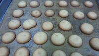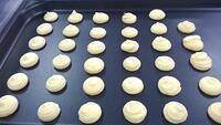 出来上がったラングドシャにガナッシュ(生クリームとホワイトチョコレートを混ぜたもの)を