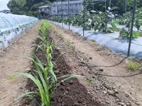 生産流通科2年生(10名)で、露地圃場で栽培しているナスの周りにソルゴーを定植しました。ソルゴーは草丈が2mを超えるため、防風としての役割があります。また、バンカープランツ(農作物に発生する害虫の天敵を呼び寄せる場所)として、農産物に発生する害虫の密度を減らす役割もあります。今回は、ソルゴーにつく害虫(アブラムシ類など)を食べる天敵(テントウムシなど)が、ナスに発生する害虫(アザミウマなど)を捕食することで、農薬の使用回数の削減を目指しています。写真は定植したソルゴーとその様子です。