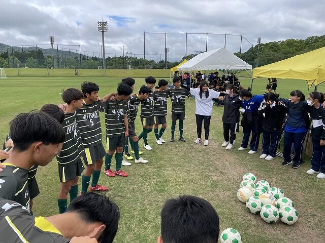5月27日から高校総体が行われました。本校は5月28日に飯野高校と都城市高城運動公園で対戦しました。チームで円陣を組み、声を掛け、気合いを入れて試合に臨みました。前半に2得点、後半にも得点することができました。また、連携した守備で相手にプレッシャーをかけて、無失点に抑えることができました。