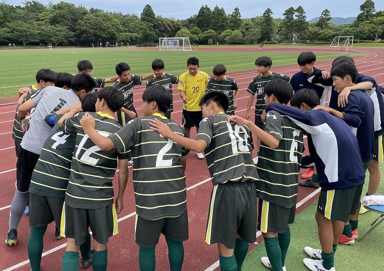 5月27日から高校総体が行われました。本校は5月28日に飯野高校と都城市高城運動公園で対戦しました。チームで円陣を組み、声を掛け、気合いを入れて試合に臨みました。前半に2得点、後半にも得点することができました。また、連携した守備で相手にプレッシャーをかけて、無失点に抑えることができました。