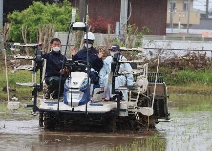 4月14日に1年生がロボット田植え実演を行いました。手放しの自動田植えに驚きました!