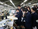 学生服縫製工場では、概要説明の後、工場内を見学し、生地管理から縫製、仕上げや検査などたくさんの工程を経て制服ができていることを知りました。工業用ミシンの試し縫いもさせていただきました。
