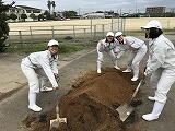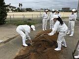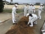 生産流通科草花農場では、1年生の「総合実習」で鉢植え用の栽培用土を作りました。基本用土の赤土に、もみ殻くん炭、ボラ土などを混ぜわせる作業をしました。