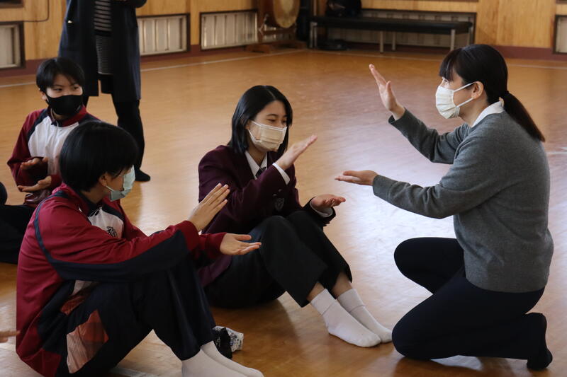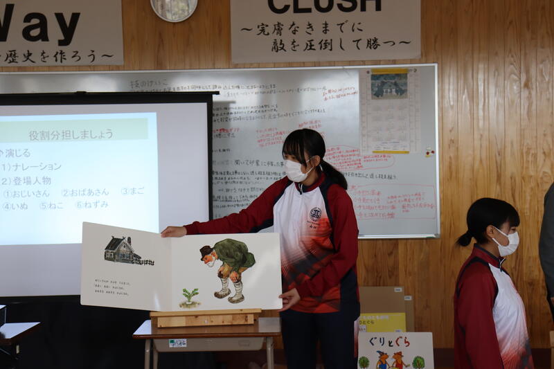 後半は、絵本の「大きなかぶ」を題材として、登場人物と楽器演奏者に分かれて初めて音付け絵本に挑戦しました。短い練習時間にも関わらず、生徒たちは登場人物になりきり協力し合って楽しい作品を作り上げることが出来ました。