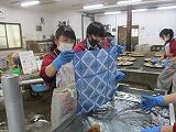 12/2(水)と12/3(木)の2日間に渡って、生活文化系列2年次生を対象としたコミュニティ・スクール事業染色講座を実施しました。講師は、綾の手紬染織工房の二上拓真さま。2日は講義を行い、藍染めのルーツや染色の工程などについて教えていただきました。3日は、実際に工房での藍染め体験。12月から本校に来ている留学生のキキさんも一緒に体験しました。二上さまはじめスタッフの方々の温かい対応に、生徒たちもずっと笑顔で楽しそう!一人一人個性あふれる作品を仕上げることができました。