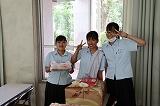 妊婦体験セットを身につけ、階段を上り下りしたり、ベッドに横になったり、靴下を脱ぎ履きしたり・・・。妊婦の生活の様子を体験するだけでなく、妊婦さんに接する機会があった場合どういう配慮が必要かについても考えてもらいました。「10ヶ月間もこんなにきつい思いをしながら大事に育ててくれた母親に感謝したい」「妊婦さんに会ったら荷物をもってあげたり自分にできることをやりたい」・・・などいろいろな気づきが見られました。