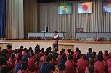 10月1日(木)2年次生2名が、国富町役場の月1回の朝礼に招かれて、防災についてのプレゼンを行いました。これは、インターンシップで国富町役場に行っていた生徒2名について町長より依頼があって実現したものです。