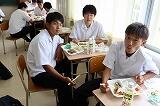 前期期末テストを終えた3年生93人が、教室でお弁当とジュースをいただきました。お弁当は、地元のお弁当屋さんである「華鮮」さんが作ってくださった牛肉炒めととんかつが入ったボリュームたっぷりのおいしいものでした。また、宮崎特産の日向夏ドリンクもいただき、幸せいっぱいおなかいっぱい、大満足の昼食となりました。