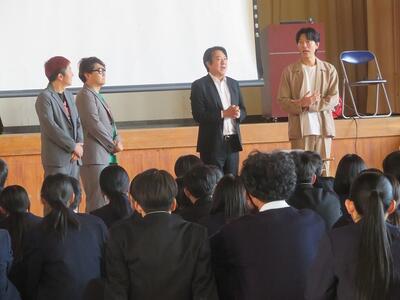 つぎに、第30回串間市美術展、第51回宮崎県アンサンブルコンテスト、「税に関する高校生の作文」などで好成績をおさめた生徒たちが登壇し、その健闘が称えられました。