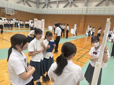 このたび、研究をさらに深め、成果をより多くの方に知っていただくことを目的として、南九州大学にて探究活動見本市と称して、中間発表会を開催しました。発表会には宮崎北高校の生徒も参加し、お互いの研究について発表・意見交換を行いました。
